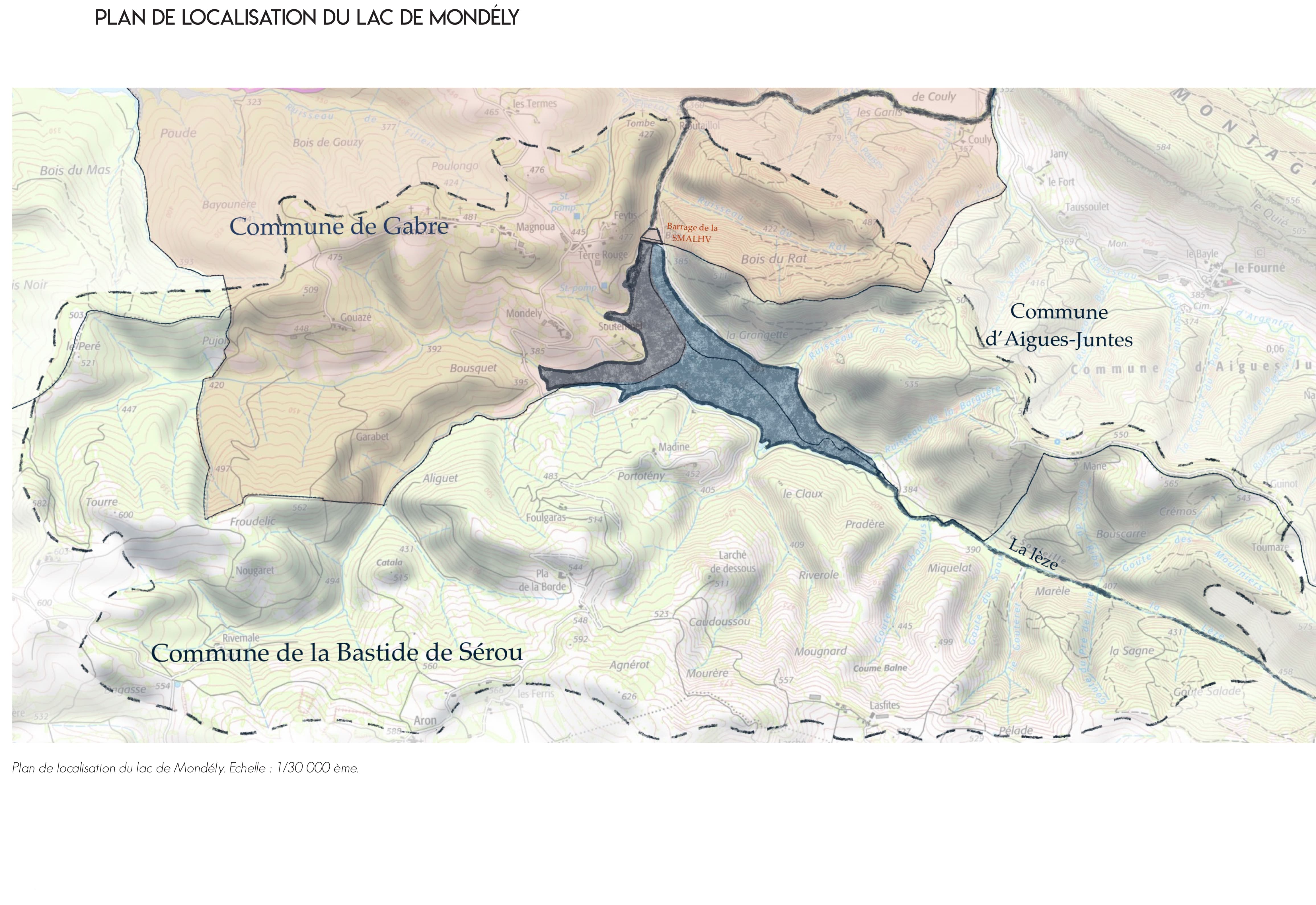 The Mondély dammed lake was filled in December 1980 and is located in the Ariège department, bordered by the communes of La Bastide-de-Sérou, Gabre and Aigues-Juntes. The lake is accessible by two roads from Le Mas-d'Azil and La Bastide-de-Sérou.